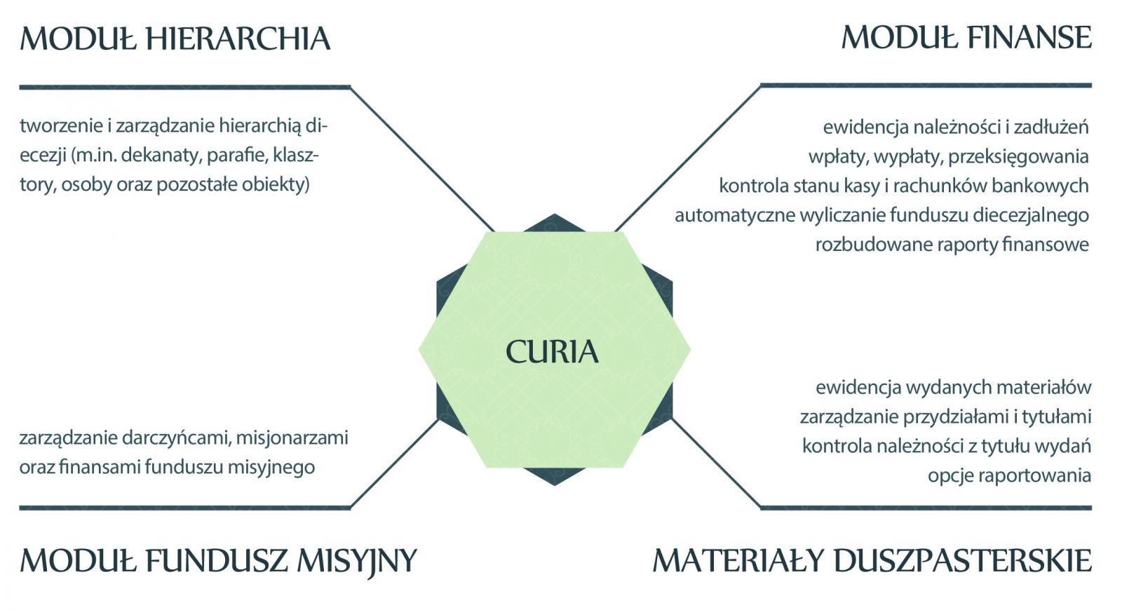 Pozwala szczegółowo śledzić i zarządzać finansami kurii. Umożliwia realizację wpłat, wypłat, przeksięgowań, a ponadto definiowanie należności, sprawdzanie zaległości parafii i osób duchownych oraz generowanie zestawień i raportów finansowych.